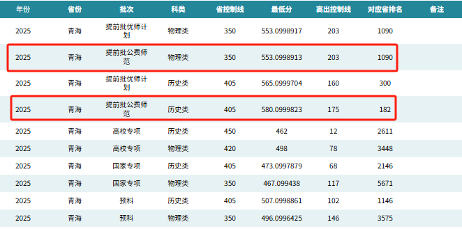 2025年历史类国家公费师范生在青海录取最低分580分,超特控线130分。