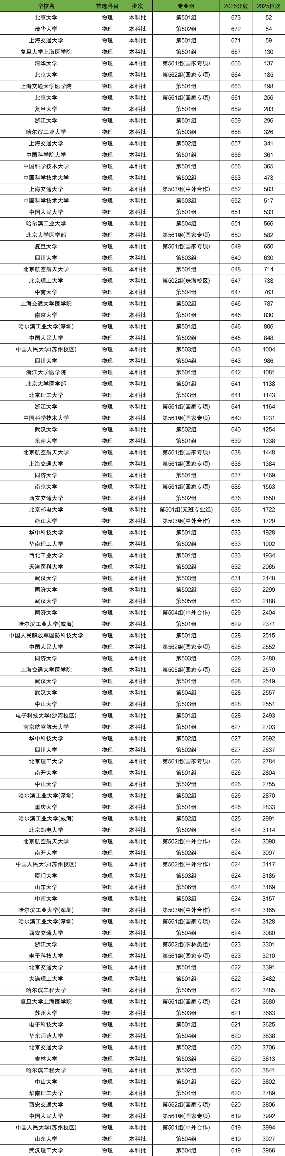 本科招生录取的大学中,录取分数线最高的是北京大学(第501组),2025年最低分是673分,对应全省位次是第52名。分数线排名靠前的还有清华大学(第502组)672分、上海交通大学(第501组)671分、复旦大学上海医学院(第501组)667分等。