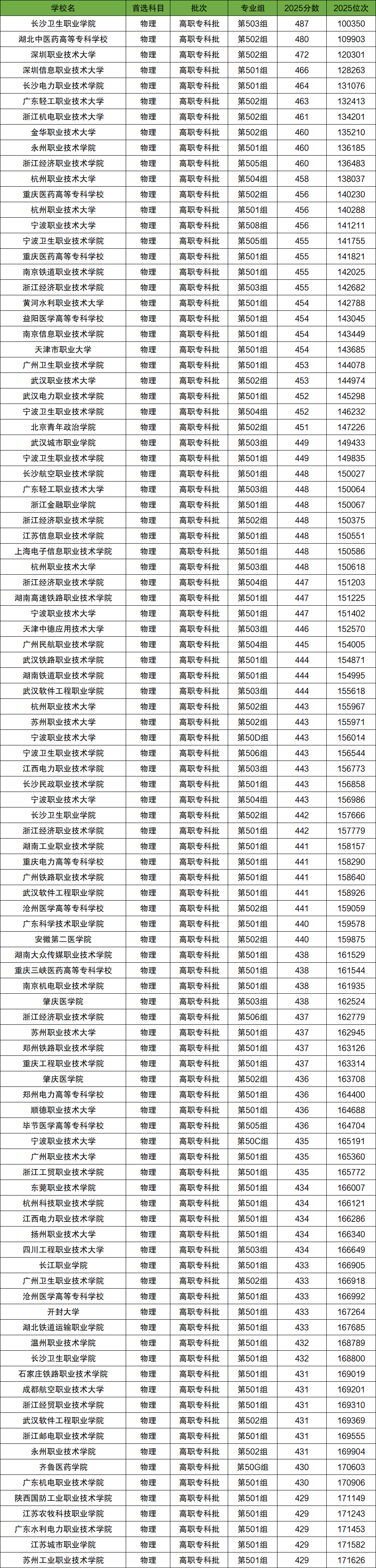 专科招生录取的大学中,录取分数线最高的是长沙卫生职业学院(第503组),2025年最低分是487分,对应全省位次是第100350名。分数线排名靠前的还有湖北中医药高等专科学校(第502组)480分、深圳职业技术大学(第502组)472分、深圳信息职业技术大学(第501组)466分、长沙电力职业技术学院(第501组)464分等。