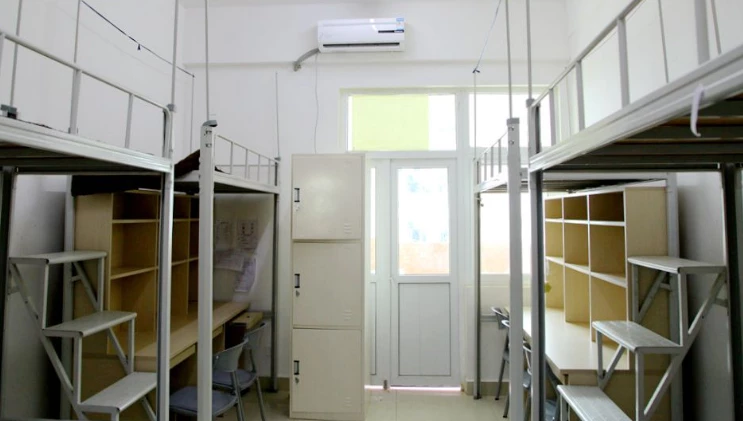 南区宿舍是8人间,上下床的,中间是两张大桌,独立浴室,有热水,有饮水机,一楼是洗衣机。北区宿舍是6人间,上床下桌,有空调,其他都是一样的。