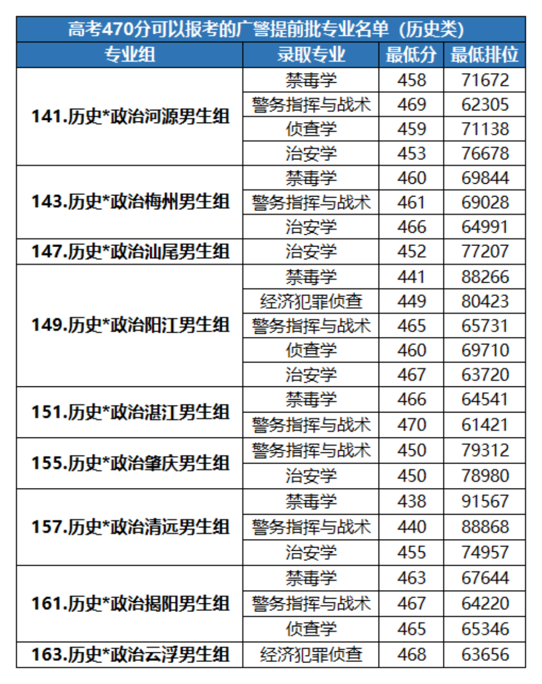 对于高考分数在470分的历史类考生而言,2023年可以报考的广警提前批专业(公安专项计划)有禁毒学、警务指挥与战术、侦查学、治安学等,高考分数在470分左右来自河源、梅州、阳江、湛江等地选科历史+政治的男生均有机会报考。