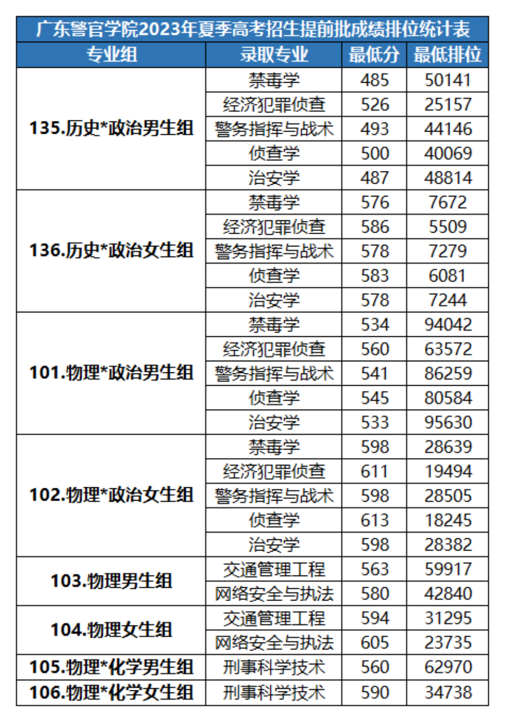 2023年广东警官学院面向男女生投档分数最低的公安专业分别是: