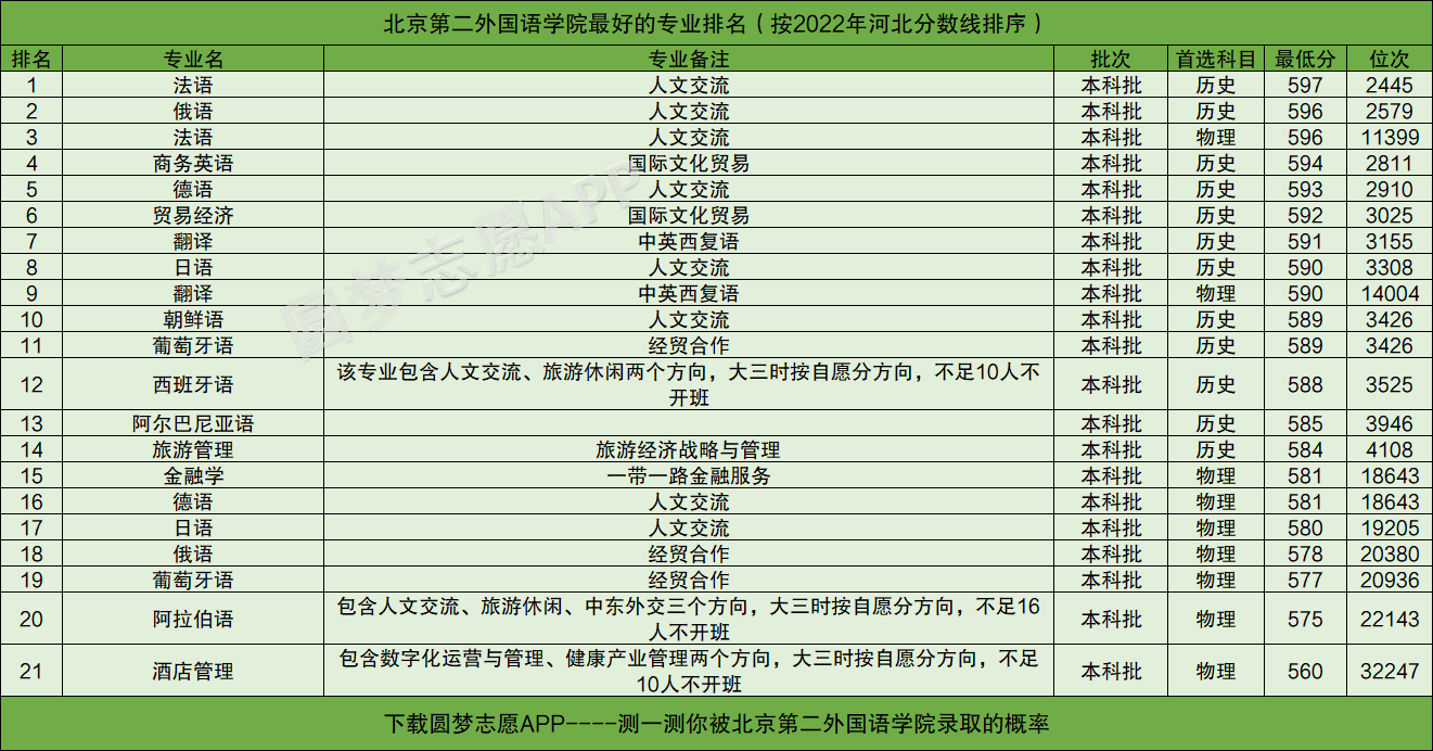 由于北京教育考试院目前还未公布2022年的专业分,所以本文将以北京第二外国语学院在河北2022年高考的录取情况为例,为大家展示北京第二外国语学院最好的专业排名。