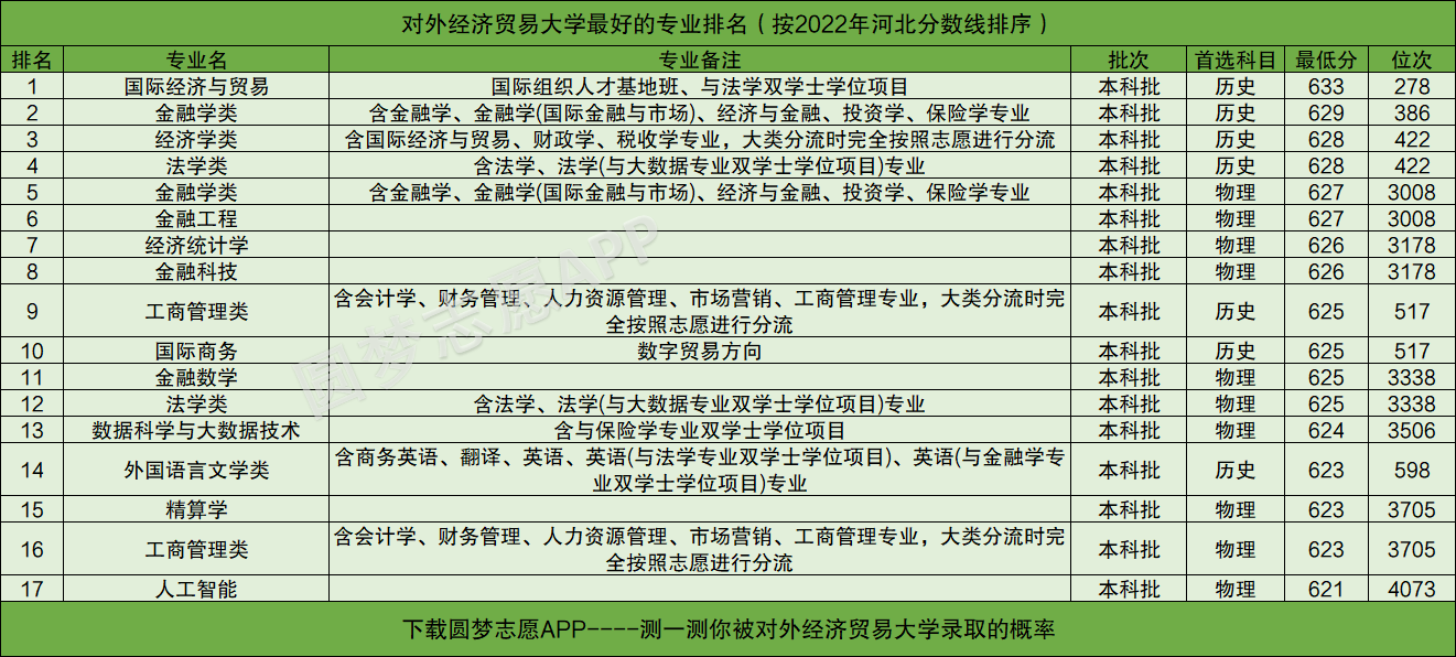 由于北京教育考试院目前还未公布2022年的专业分,所以本文将以对外经济贸易大学在河北2022年高考的录取情况为例,为大家展示对外经济贸易大学最好的专业排名。