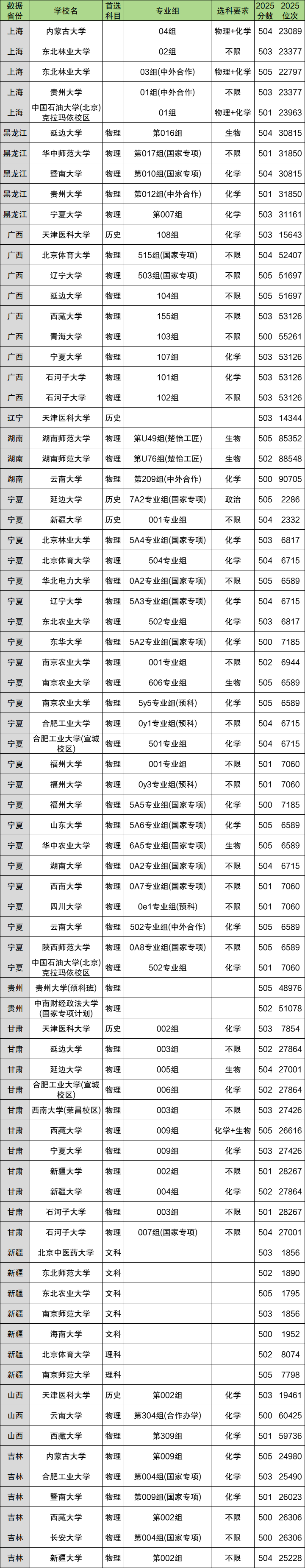 只有物理类:延边大学第016组504分、华中师范大学第017组(国际专项)501分、暨南大学第010组(国家专项)504分、贵州大学第012组(中外合作)501分、宁夏大学第007组503分。