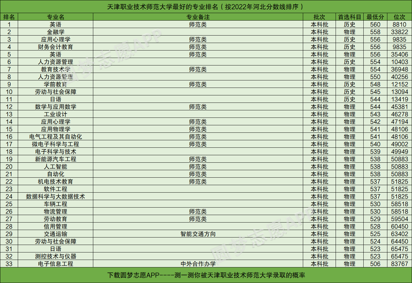 由于天津市教育招生考试院目前还未公布2022年的专业分,所以本文将以天津职业技术师范大学在河北2022年高考的录取情况为例,为大家展示天津职业技术师范大学最好的专业排名。