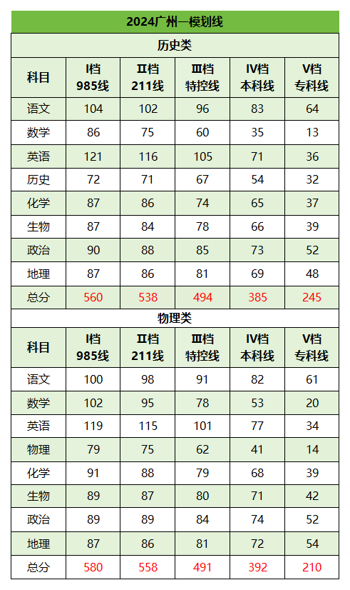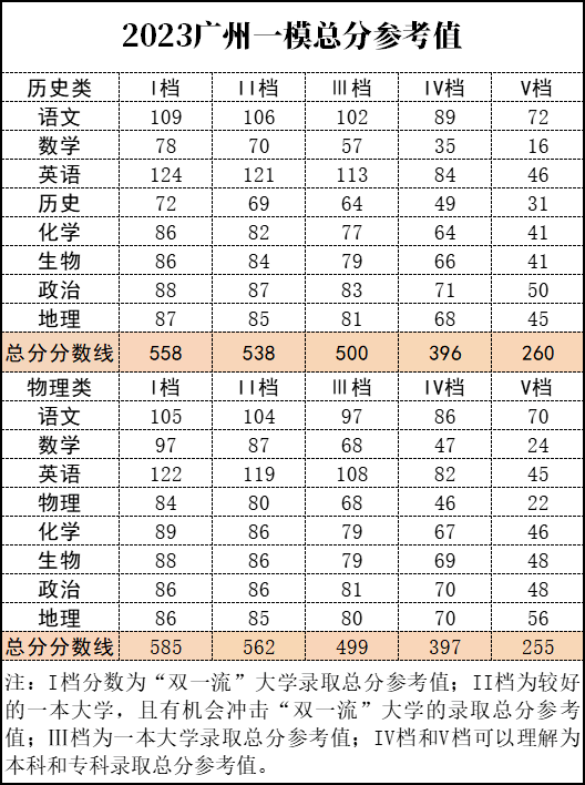 2024年广州一模划分了5个档次的分数线,包括985线、211线等,所以大家可以直接按照这个分数线来评估定位志愿院校。