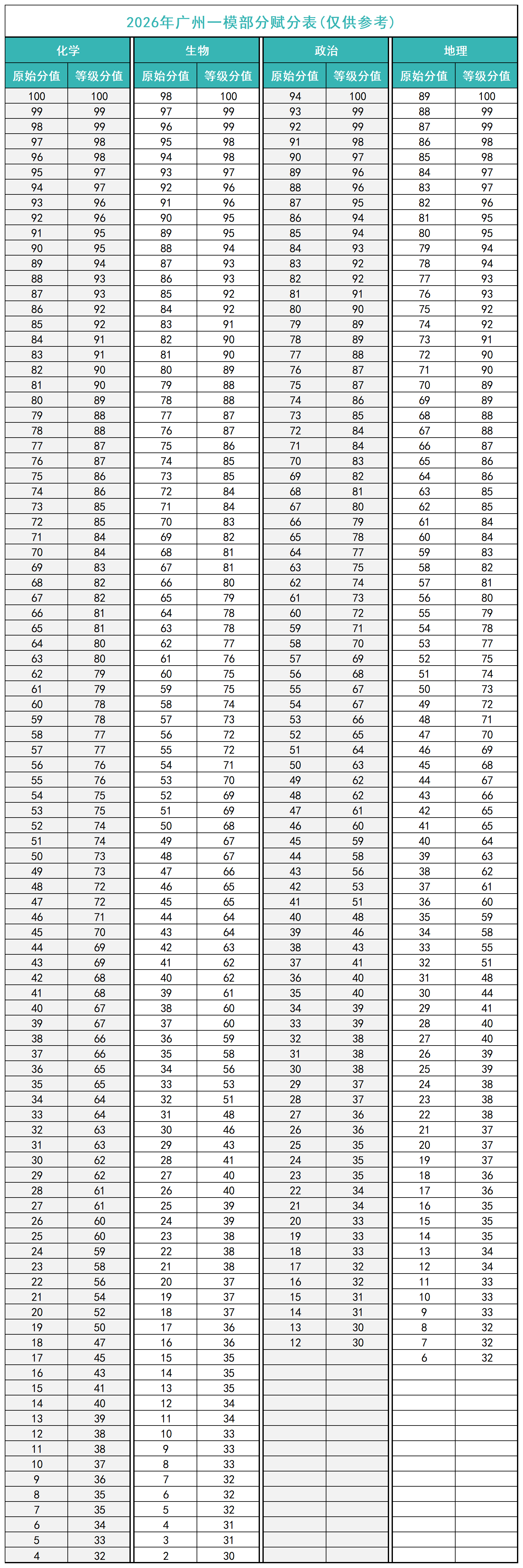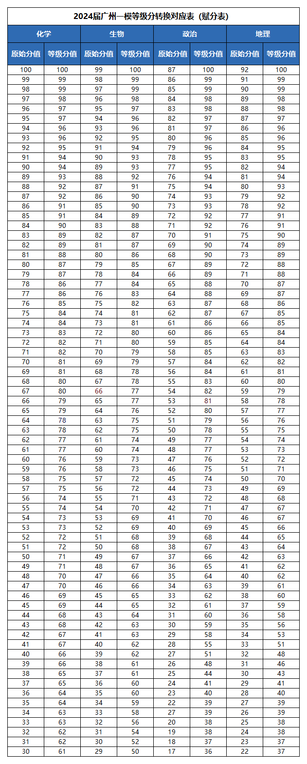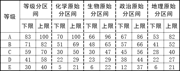 因为采用的新高考模式,所以各选科成绩均为赋分之后的分数,下面附上生物、化学、政治和地理的赋分表,以供大家参考: