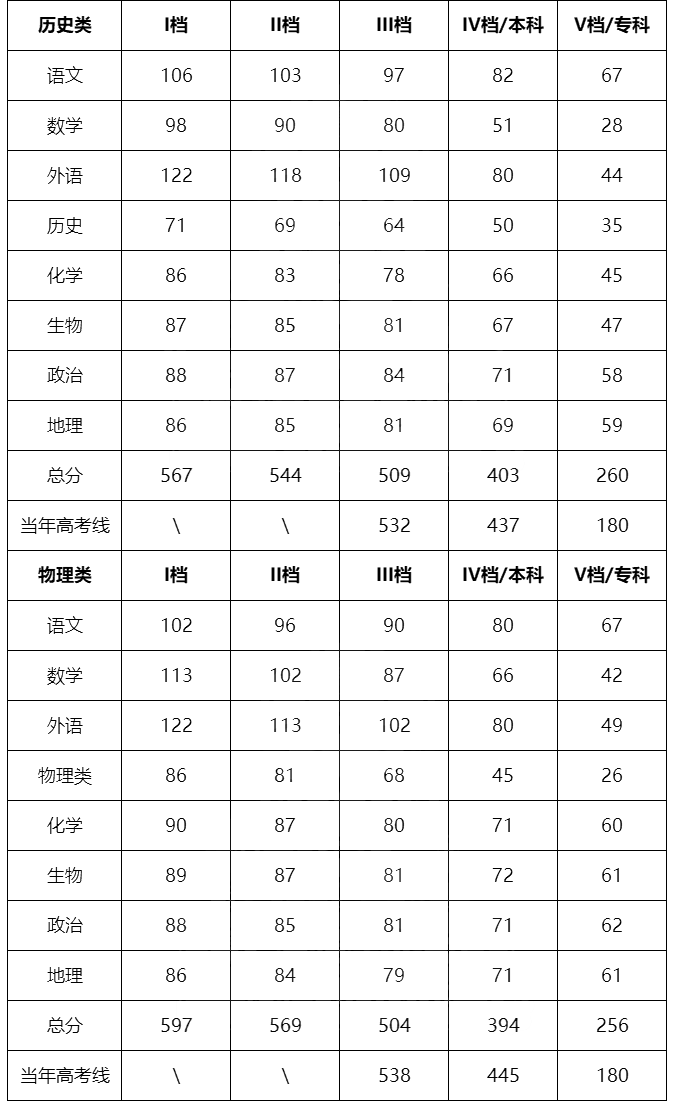 历史类:I档线564分、II档线544分、III档线502分、IV档线401分、V档线230分;