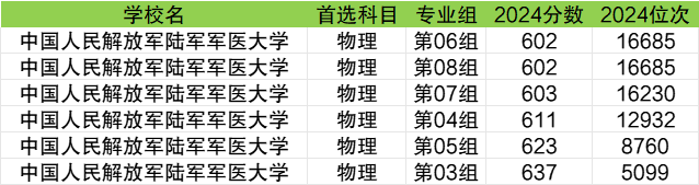 2024年物理类录取分数线最低的军医大学院校是:中国人民解放军陆军军医大学,学校收分最低的专业组为06组,最低分为602分,对应排名16685名。