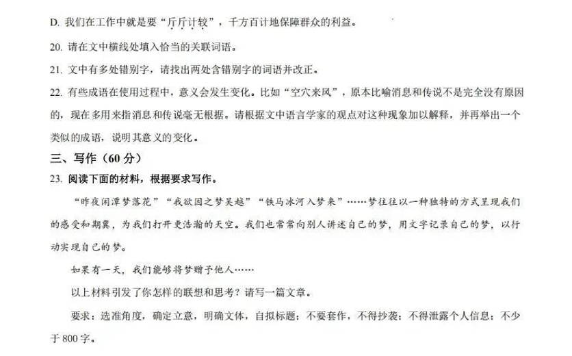 要求:选准角度,确定立意,明确文体,自拟标题;不要套作,不得抄袭;不得泄露个人信息;不少于800字。