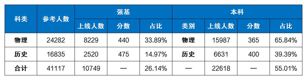 历史类:强基线为475分(2520人上线,占比14.97%),本科线为400分(6631人上线,占比39.39%);