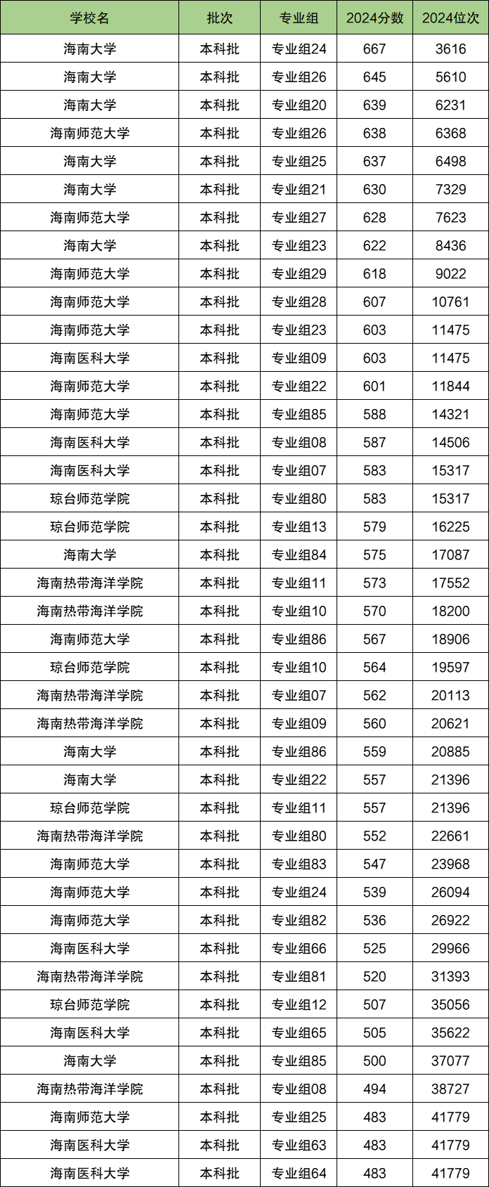 2025年海南省前五名大学的招生分数线在667分~483分之间,最低位次在3616~41779名。如海南大学最低500分、海南医科大学最低483分、海南师范大学最低483分。