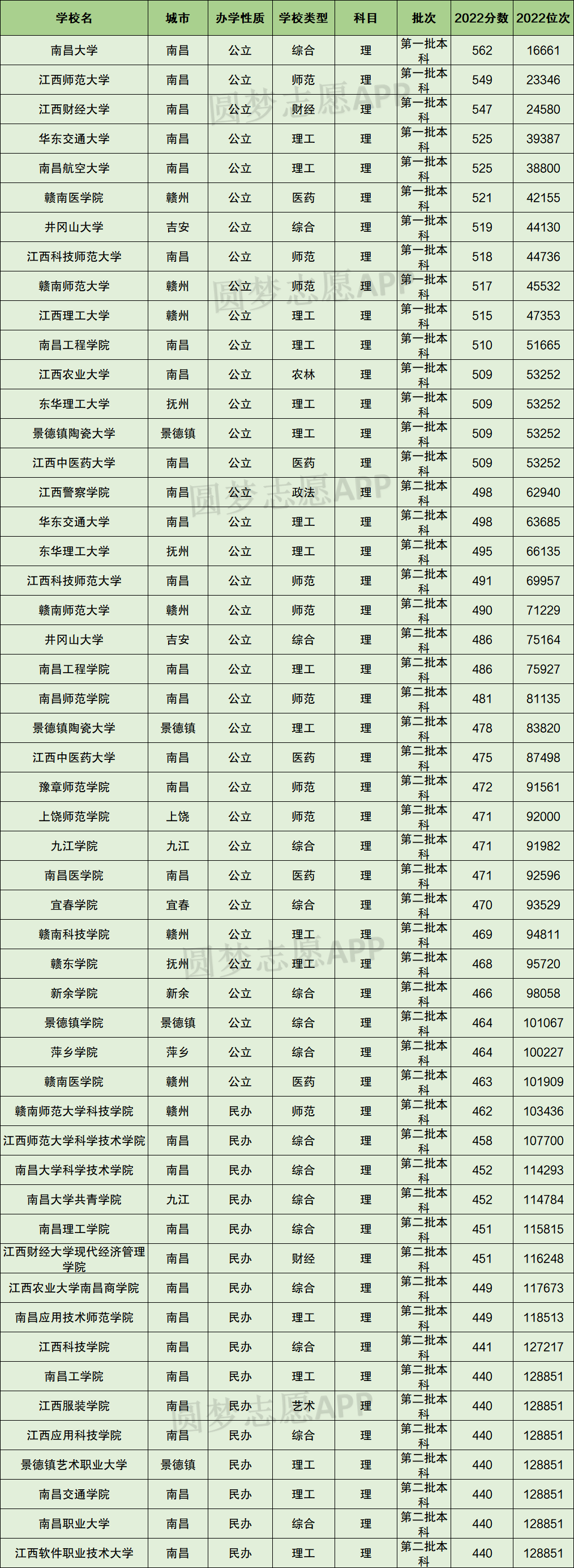 1、江西省理科分数最高的本科大学为南昌大学,最低录取分数线为562,对应最低位次为16661。