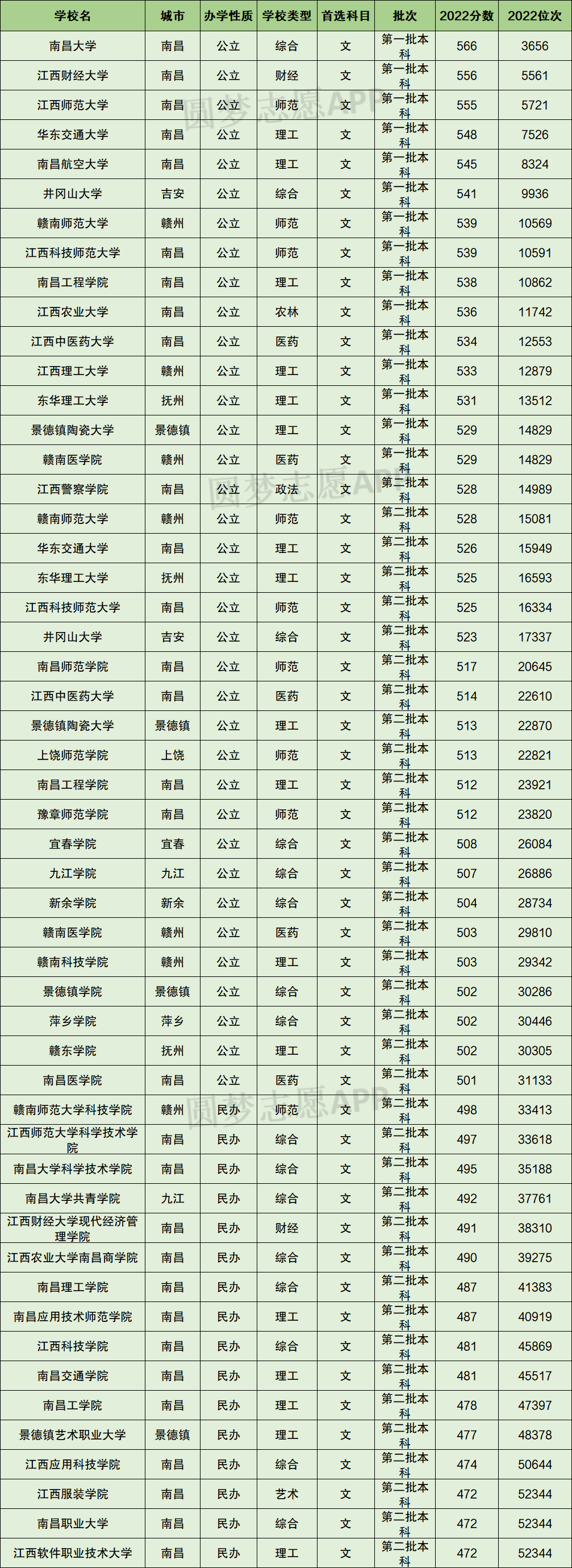 1、江西省文科分数最高的本科大学为南昌大学,最低录取分数线为566,对应最低位次为3656。