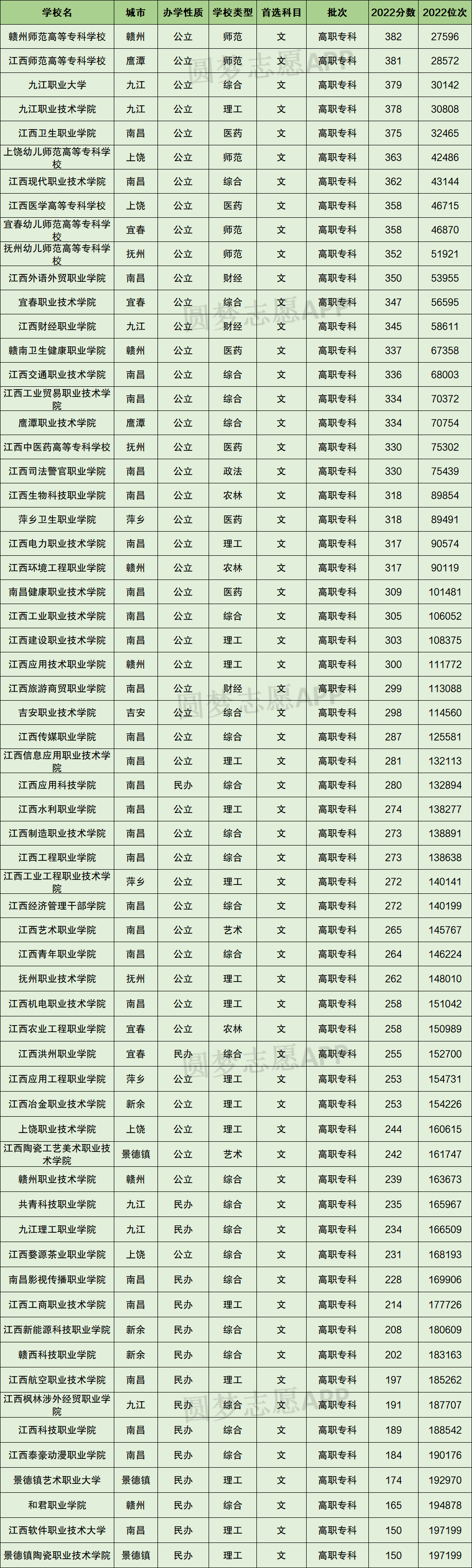 2、江西省文科分数最低的专科大学为景德镇陶瓷职业技术学院、江西软件职业技术大学,录取分数为150分、最低录取位次为197199。