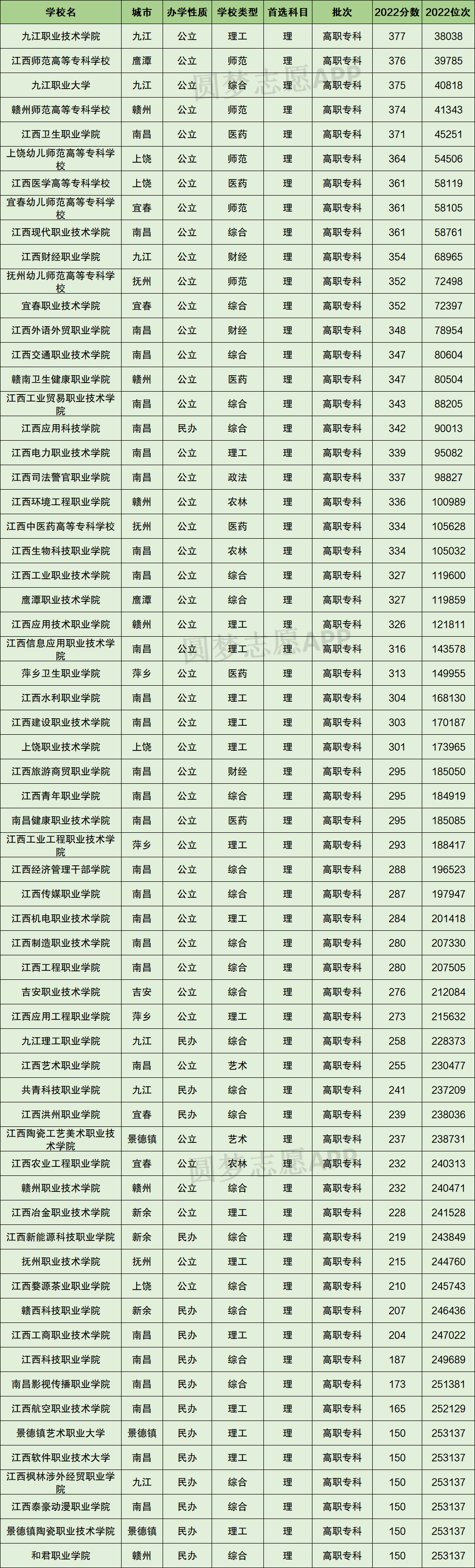 1、江西省理科分数最高的专科大学为九江职业技术学院,录取分数线为377分,录取位次为38038;其次为江西师范高等专科学校,最低分数为376分,对应全省最低位次为39785。