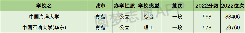 以下为中国海洋大学、中国石油大学(华东),2022年在青岛市的最低分数线