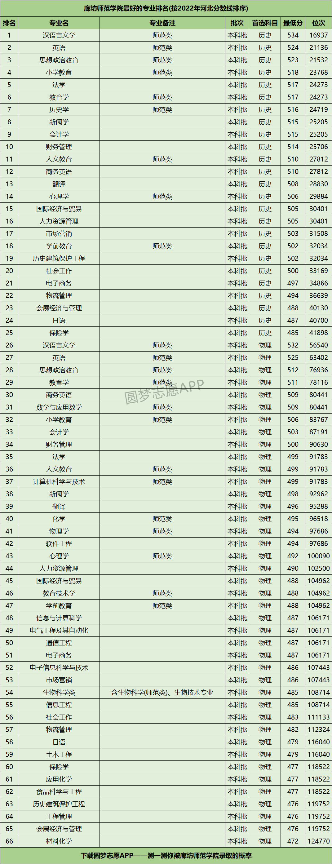 友情提醒:下载圆梦志愿APP,可查阅廊坊师范学院在你的高考省份各专业的录取分数线、位次排名。(各大手机应用市场均可下载圆梦志愿APP)
