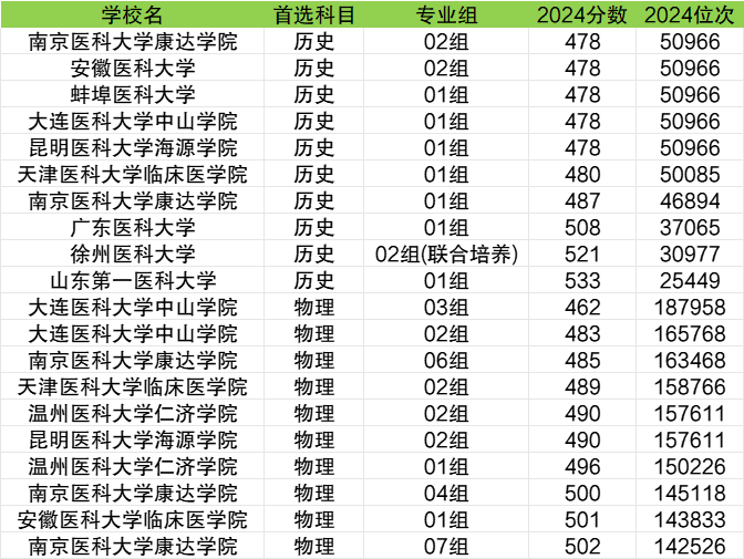 2024年历史类录取分数线最低的医科大学院校是:南京医科大学康达学院等,学校收分最低的专业组为02组等,最低分为478分,对应排名50966名。