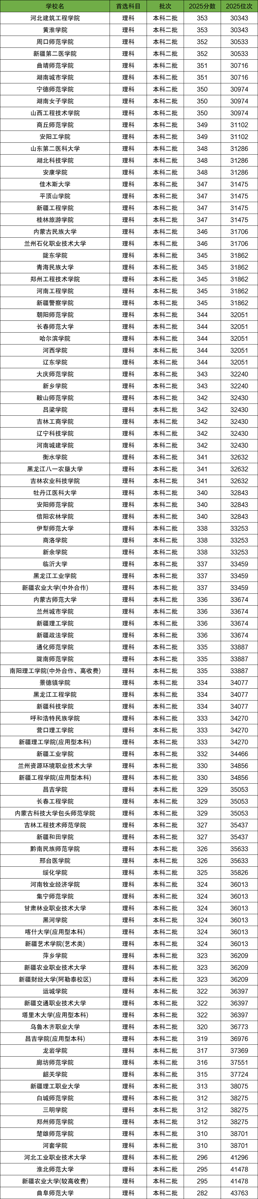 2025年理科公办二本大学院校名单共计363所,录取分数线范围是282分到464分。低分段的公办二本大学有楚雄师范学院、河套学院、河北工业职业技术大学、淮北师范大学、新疆农业大学(较高收费)、曲阜师范大学等。