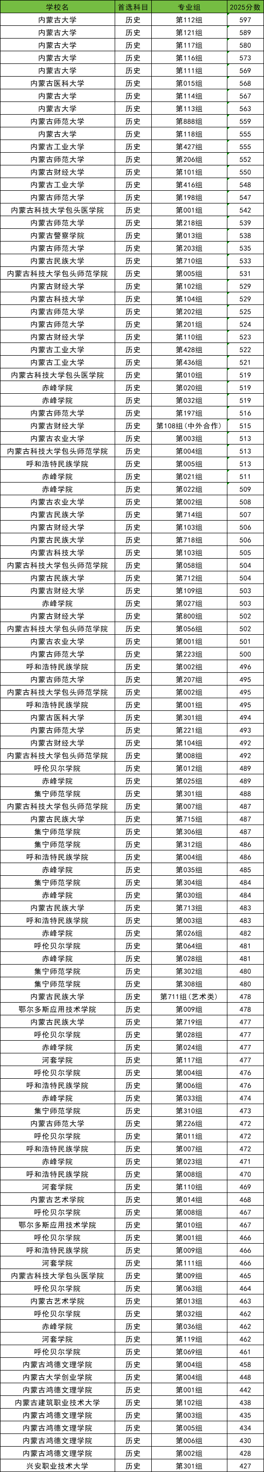 下面是2025年内蒙古自治区内本科高校历史类录取分数线一览表: