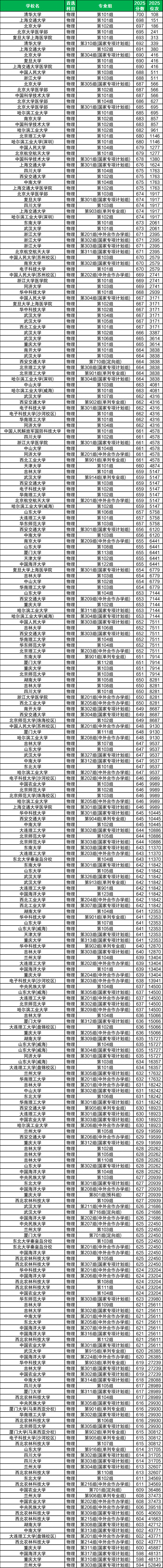 包含西安交通大学101组(640分、874名)、华东师范大学101组(639分、936名)、哈尔滨工业大学115组(637分、1047名)、天津大学101组(636分、1112名)、中南大学101组(631分、1475名)等。