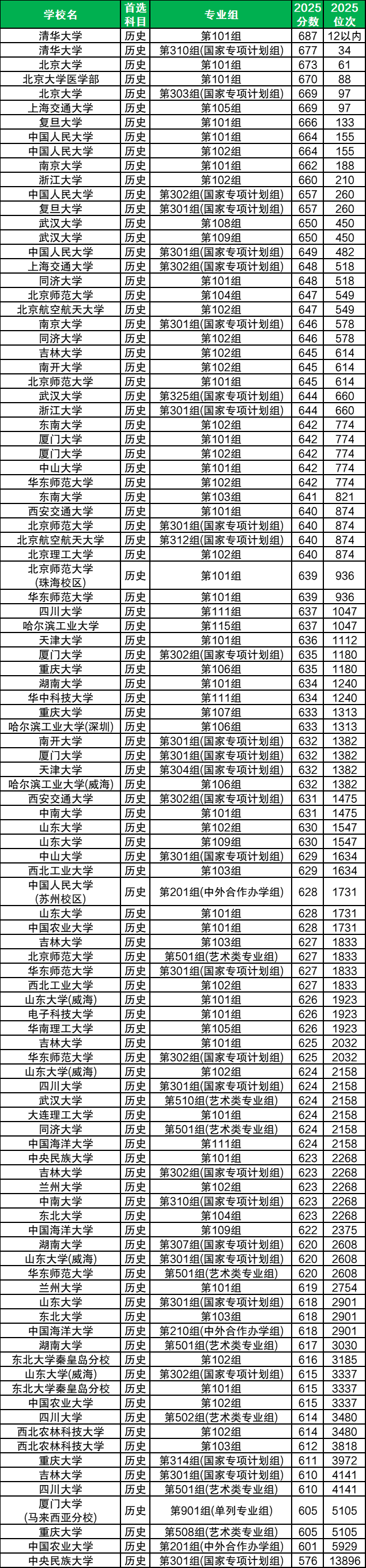 2025年985大学在河南历史组招生的分数在576分到687分之间不等,招生专业组共计104个。最高分院校是清华大学(101组),2025年投档最低分为687分,对应最低位次12名以内,是历史组中最难报考的985院校。除此之外,分数超过660分的院校专业组还有北京大学101组(673分、61名)、上海交通大学105组(669分、97名)、复旦大学101组(666分、133名)等,可供高分考生冲刺选择。