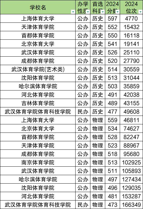 此外分数线超500分的还有首都体育学院,2024最低分历史组550分、物理组528分;武汉体育学院,历史组526分、物理组511分;天津体育学院,历史组552分、物理组523分;南京体育学院,物理组513分。