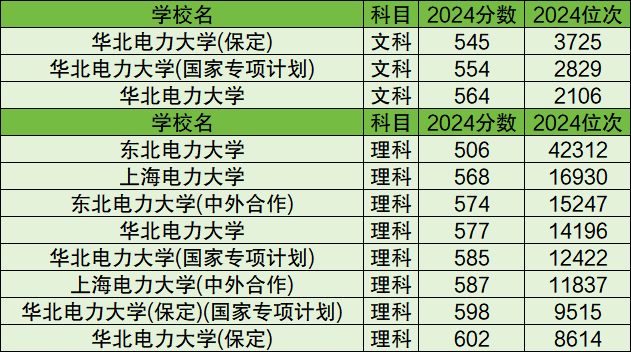 根据数据可知,2024年陕西省文科收分最低的电力大学有华北电力大学(保定),最低录取分为545分;理科收分最低的也是东北电力大学,最低录取分为506分。