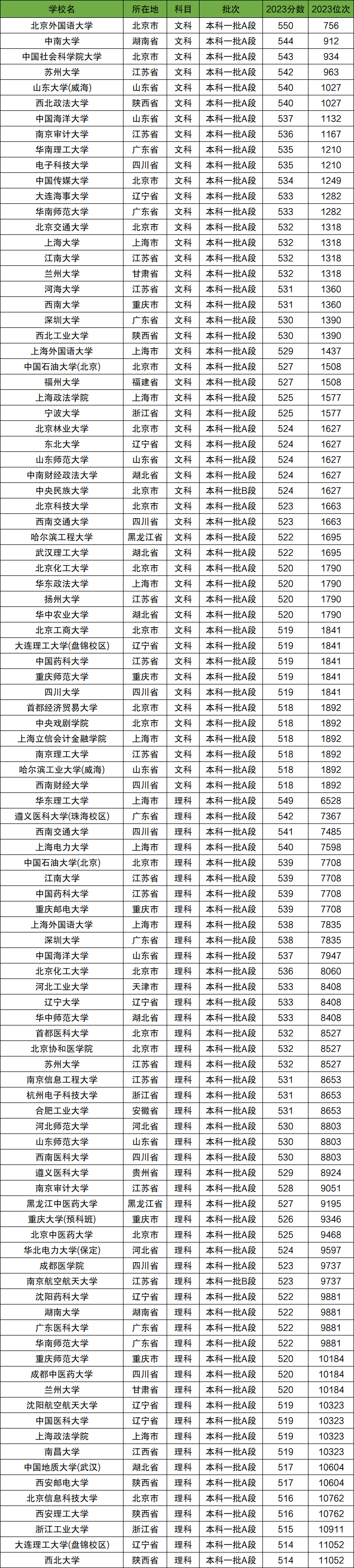 下表为2023年全国大学在吉林高考中,录取分数在500分的大学名单。
