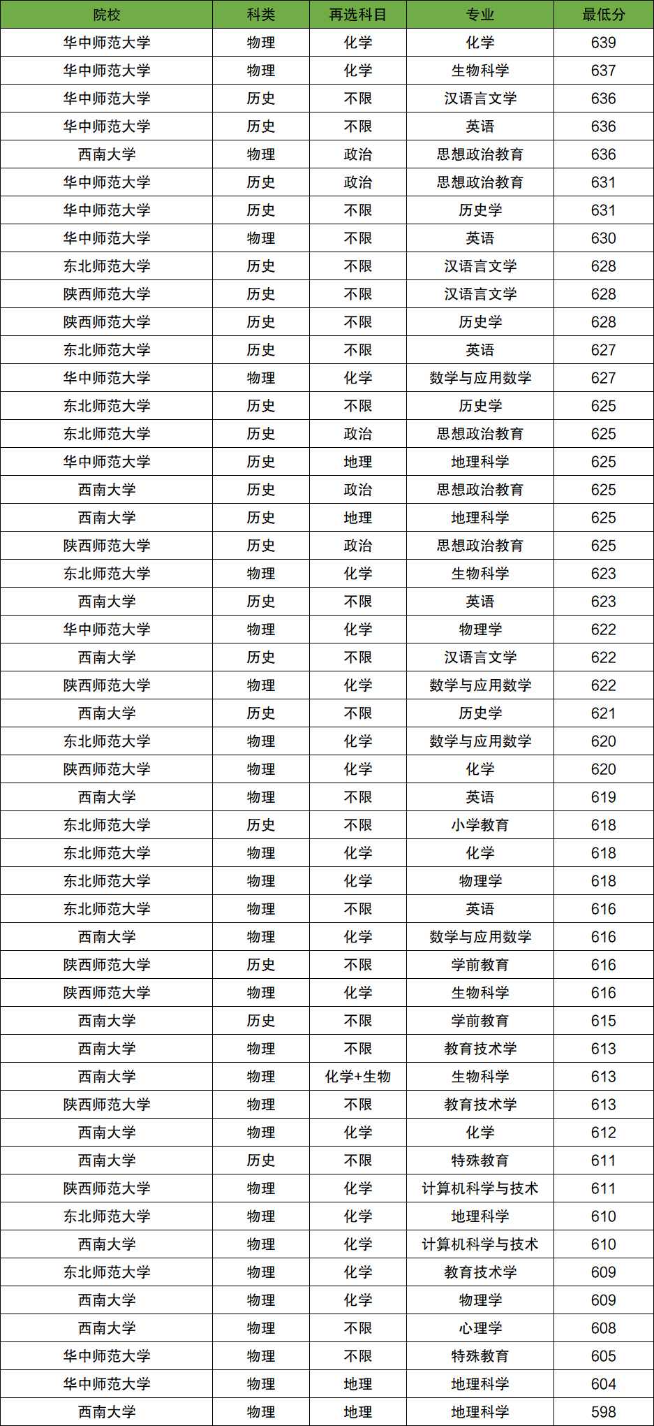 除此之外还有东北师范大学、陕西师范大学等,下表为具体学校名单及分数线。