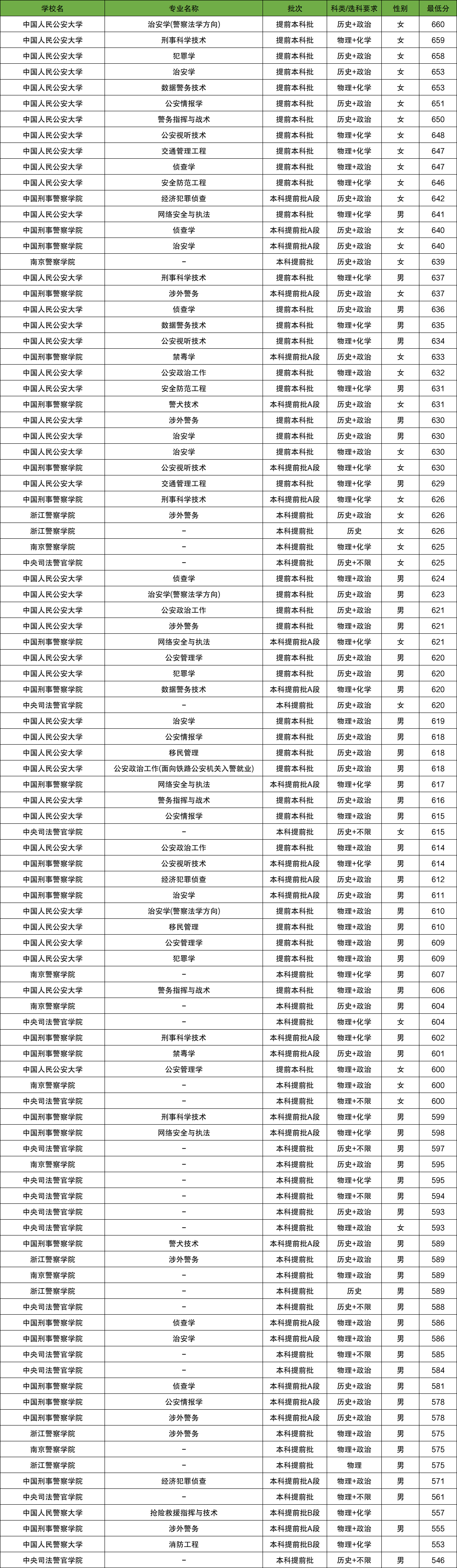 浙江警察学院(男生):历史类最低589分、物理类最低575分。