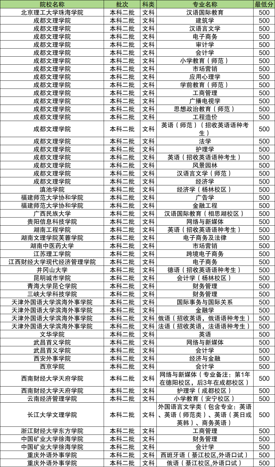 从全国大学四川省高考的分数来看,500分的文科考生能报考的专业,以及对应的学校如下表:
