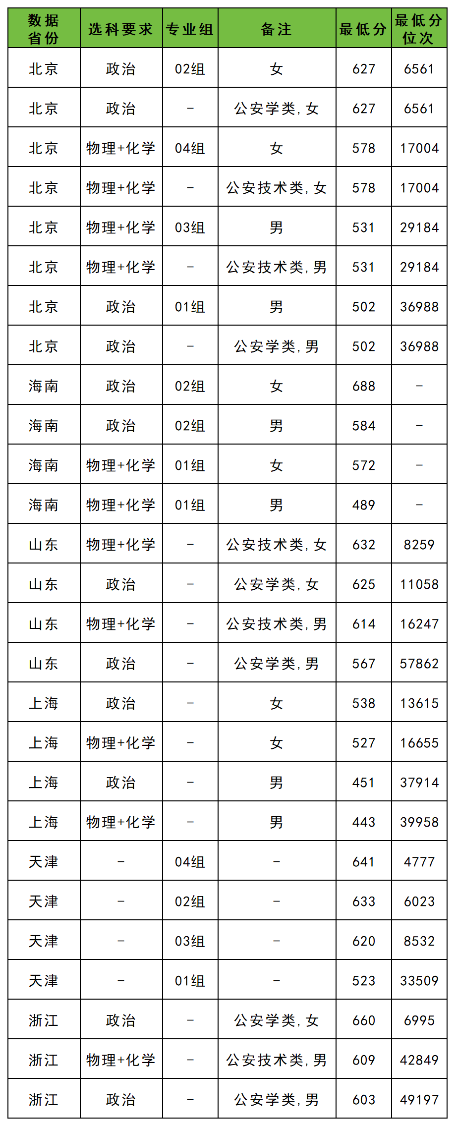二、中国刑事警察学院全国录取线一览表