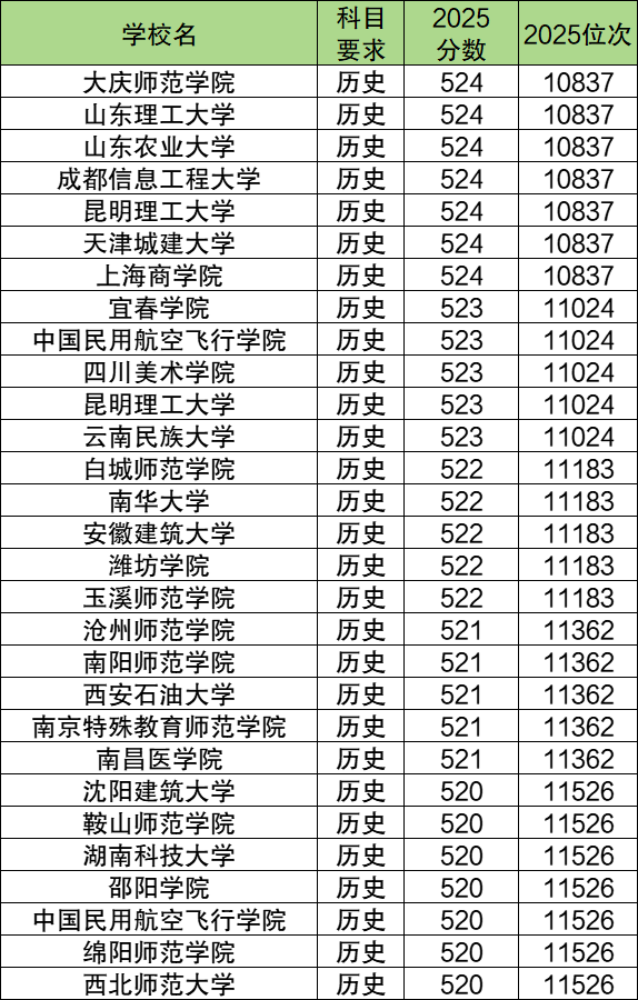 2025年辽宁历史类特控线附近(520分到524分)能上的本科院校一共有27个,排名靠前的有大庆师范学院(10837名)、山东理工大学(10837名)、山东农业大学(10837名)等,这些属于特控线附近考生可以冲一冲的学校。