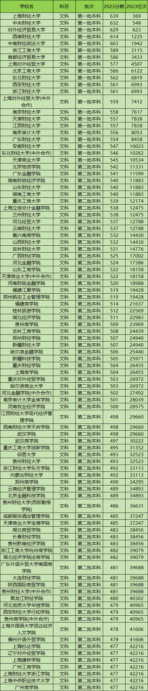 全国财经大学分数线文科榜单一览: