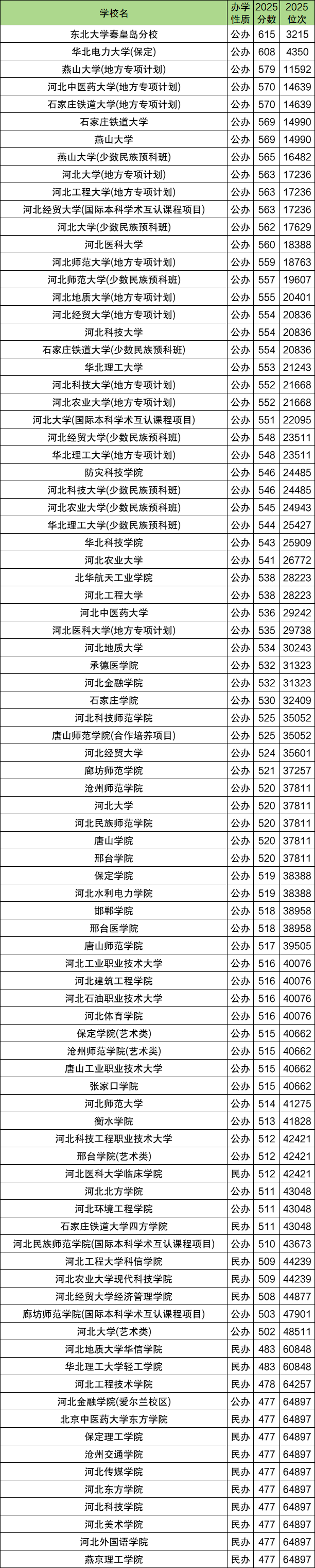 一、河北各大学2025录取分数线:历史类