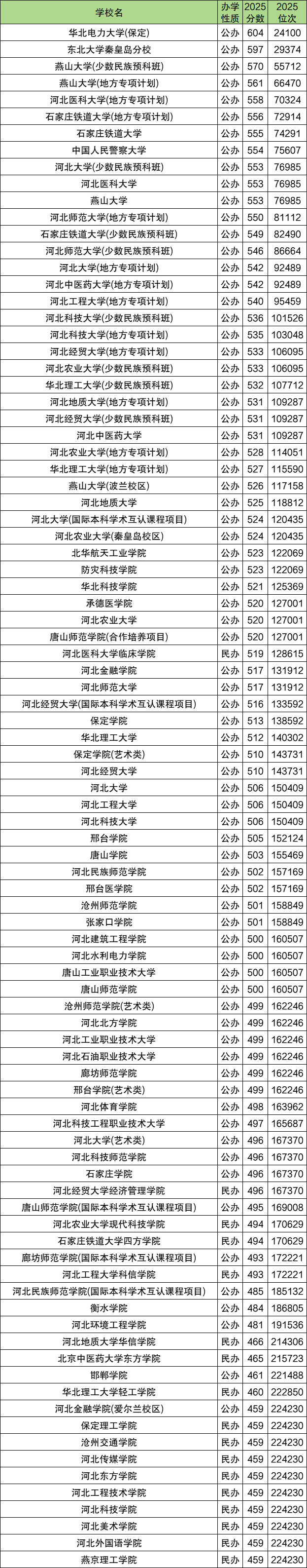 低分段(500分以下,位次6万后):主要为民办院校,如河北地质大学华信学院(483/60848)、华北理工大学轻工学院(483/60848)和河北金融学院爱尔兰校区(477/64897)。这些学校录取门槛较低,适合位次靠后的考生保底。
