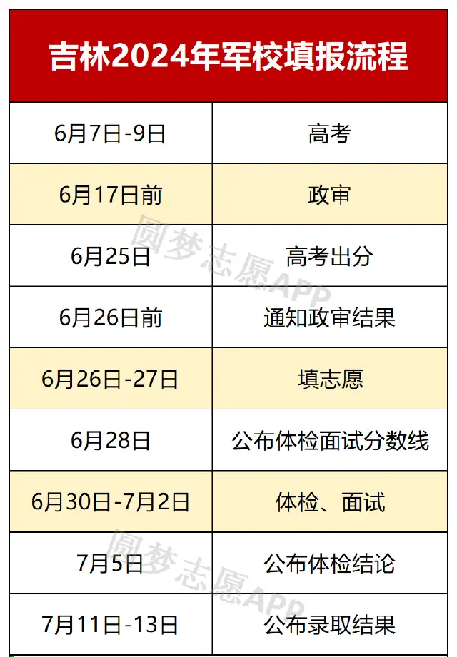 2025年吉林军校报考流程主要包括填报志愿(6月26日-27日)、政审(6月17日前)、面试体检(6月30日-7月2日)等。想要报考军校需要满足年龄16到20岁、符合军队院校体检标准等条件。完整流程及时间安排表如下。