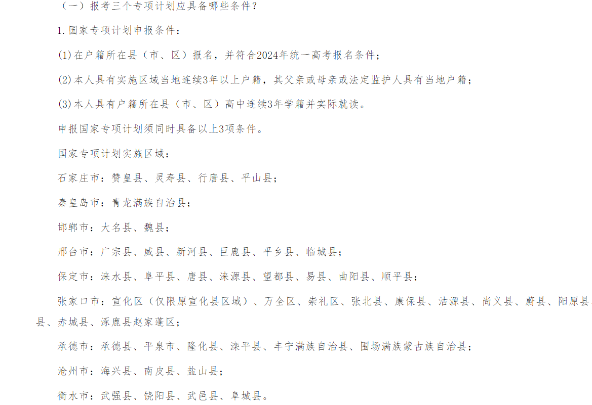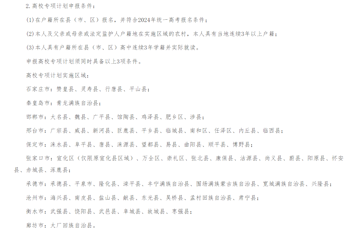 2025年河北省高校专项计划申报时间在4月份,未报名的同学将不能享受相应的招生优惠政策。本文整理2025年河北省高校专项计划、地方专项计划以及国家专项计划报考条件汇总,并附上2025年河北专项计划实施区域,供查阅。