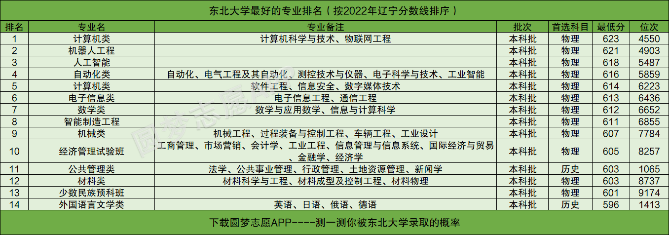 友情提醒:下载圆梦志愿APP,可查阅东北大学在你的高考省份各专业的录取分数线、位次排名。(各大手机应用市场均可下载圆梦志愿APP)