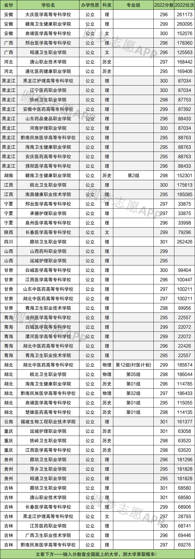 筛选全国录取分数线在295分-301分之间的医药类学校,为大家整理全国300分可以上的医学专科学校公办名单一览表如下。更多分数线能上的大学,可下载圆梦志愿APP查询。
