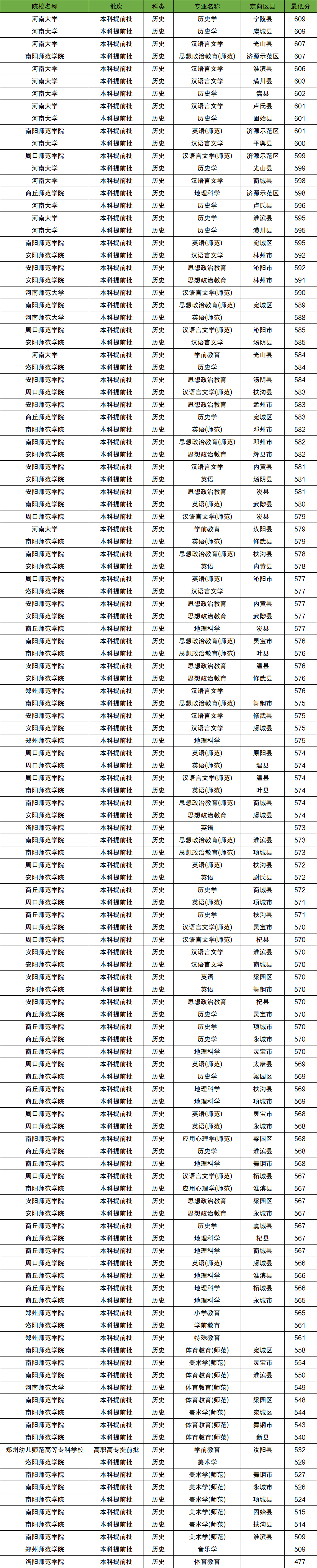 其中在历史科目类中收分最高的大学及专业为河南大学(历史学),2025年最低投档线为609分;收分最低的公费师范院校为洛阳师范学院(体育教育),2025年最低投档线为477分。