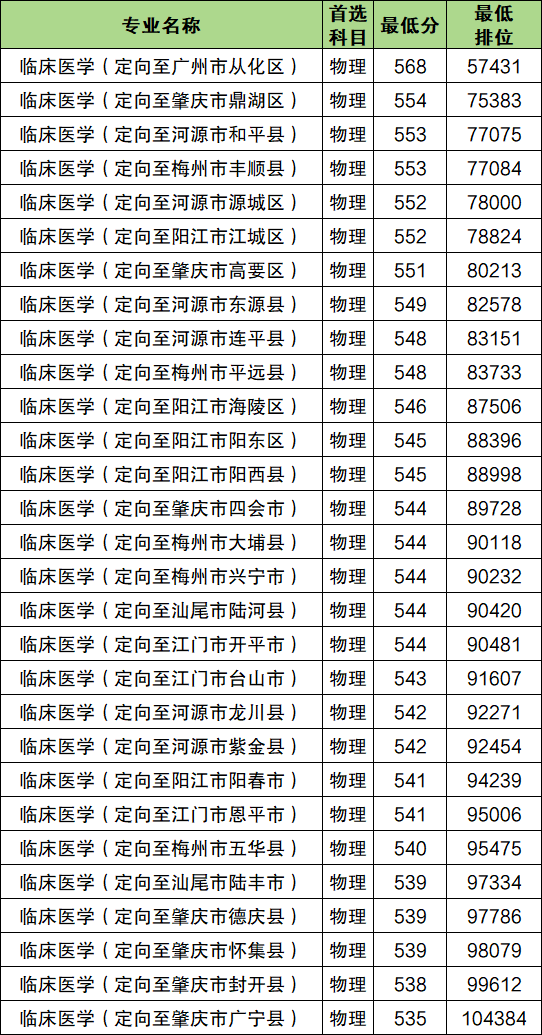 嘉应学院:2025年定向医学生录取分数线最低是535分,最低排位104384名,定向至定向至肇庆市广宁县。