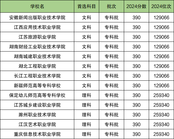 文科分数线刚好为390分的大学:安徽新闻出版职业技术学院、江西应用技术职业学院、江苏旅游职业学院、湖南财经工业职业技术学院等;