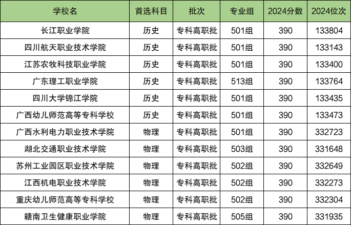 历史组分数线在390分的大学及专业组:长江职业学院501组、四川航天职业技术学院501组、江苏农牧科技职业学院501组等;