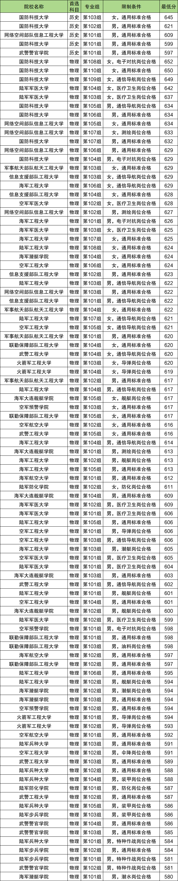 2025年在广东历史组招生的军校有两所,录取分数线最低是597分,对应收分最低的为武警警官学院101组。录取分数线最高的是国防科技大学103组,2025年最低投档分为630分,各军校专业组最低分是: