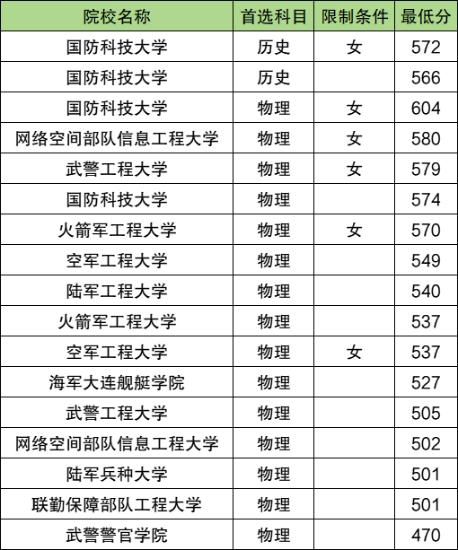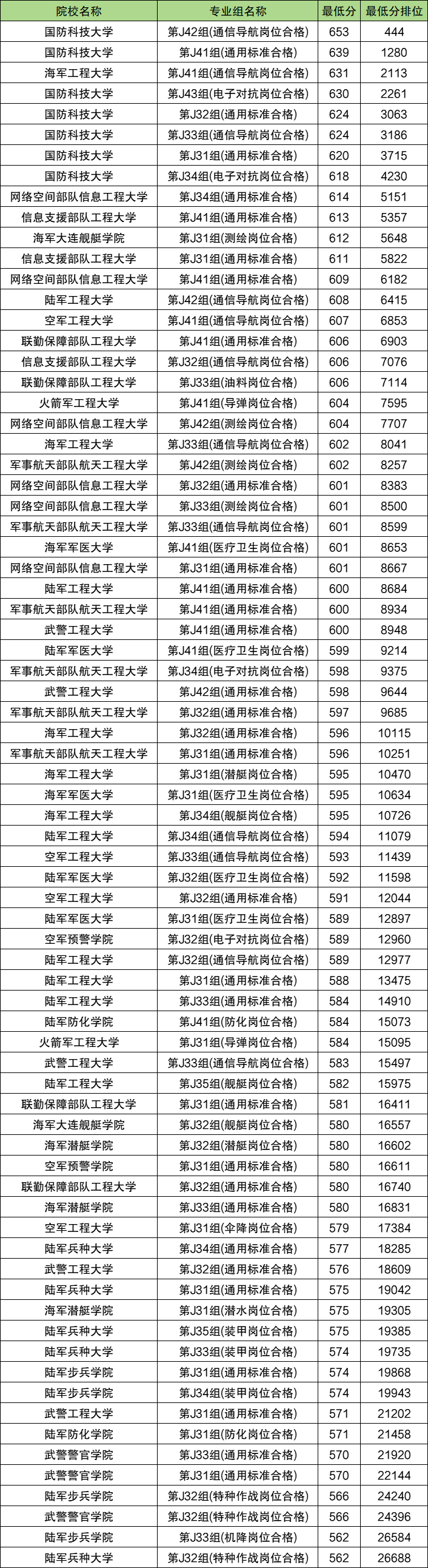 2025年全国提前批军校录取分数线已经公布:江苏省军校历史类最低600分录取、物理类最低590分;宁夏物理类最低566分录取,物理类最低分数为470分。