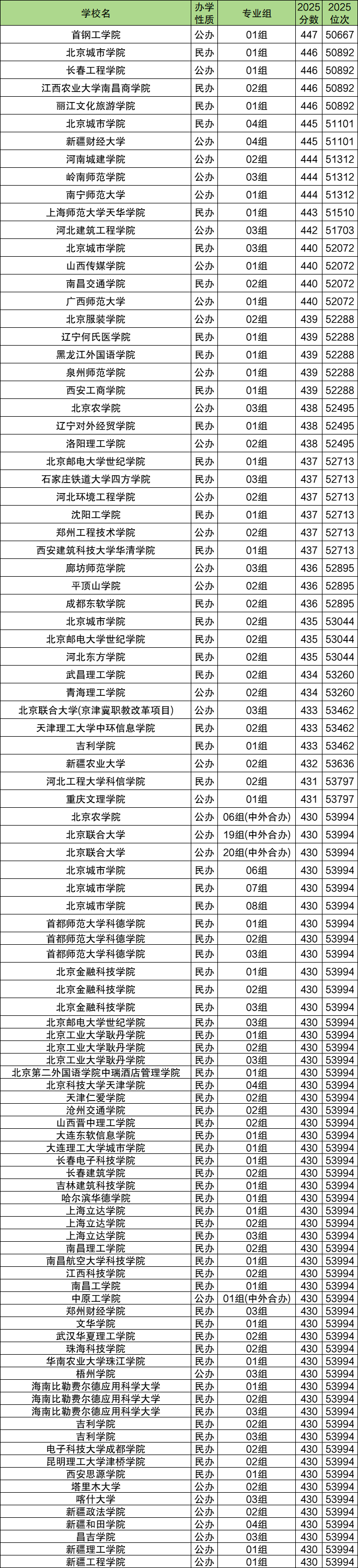 对于分数线较低的同学来说,可以选择北京联合大学、沧州交通学院、长春电子科技学院、南昌理工学院、郑州财经学院等,这些大学2025年最低分是430分,也就是说刚上本科线就能被录取。
